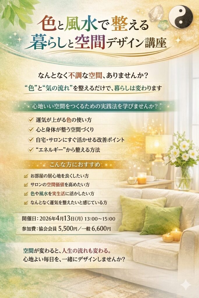 【4月13日開催】色と風水で整える暮らしと空間デザイン講座のお知らせ