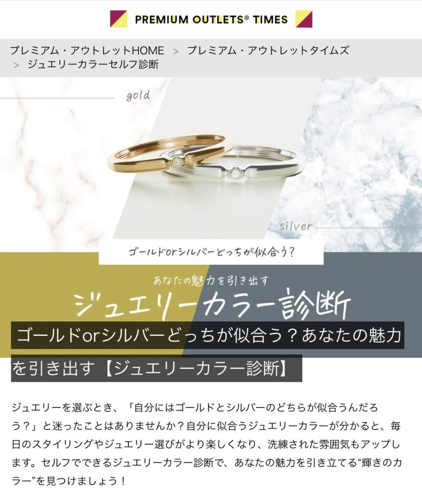 PREMIUM OUTLETS TIMES「ゴールドorシルバーどっちが似合う?」ジュエリーカラー診断の記事を監修いたしました。